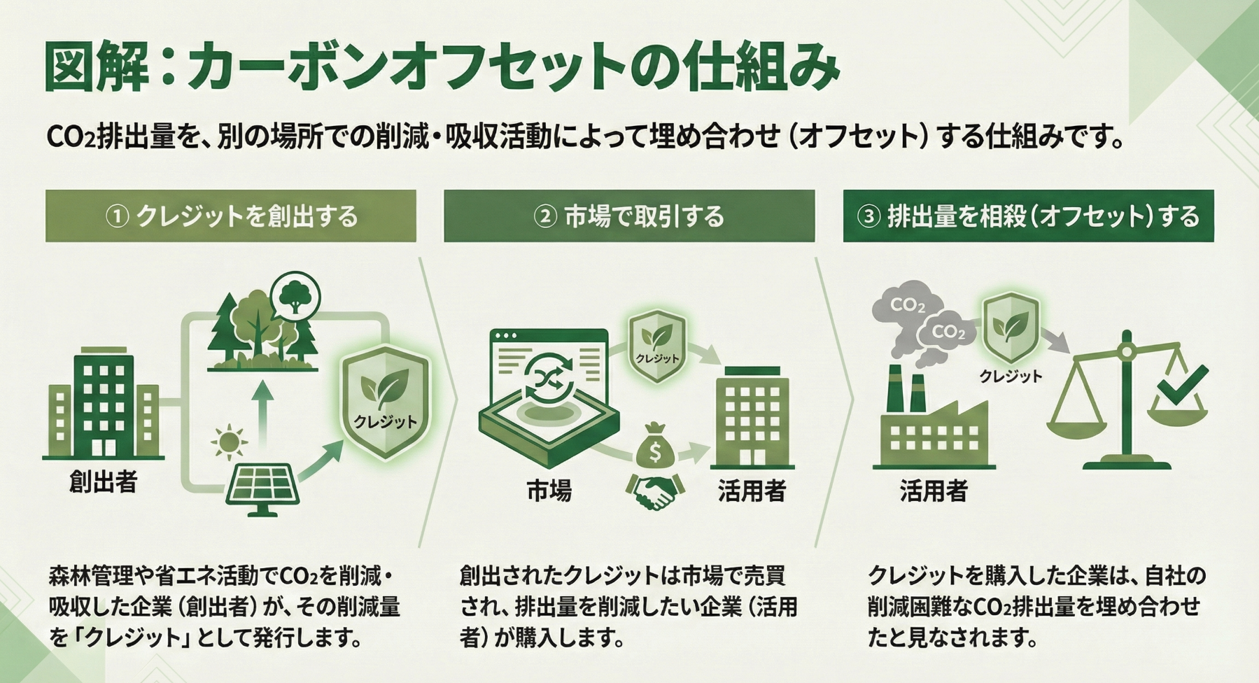 対照的に、別の企業がどうしても削減できないCO2を100トン排出している場合、このクレジットを購入することで、自社の排出した100トンを「相殺(オフセット)」したと見なせます。これがカーボン・オフセットの基本的な考え方です。