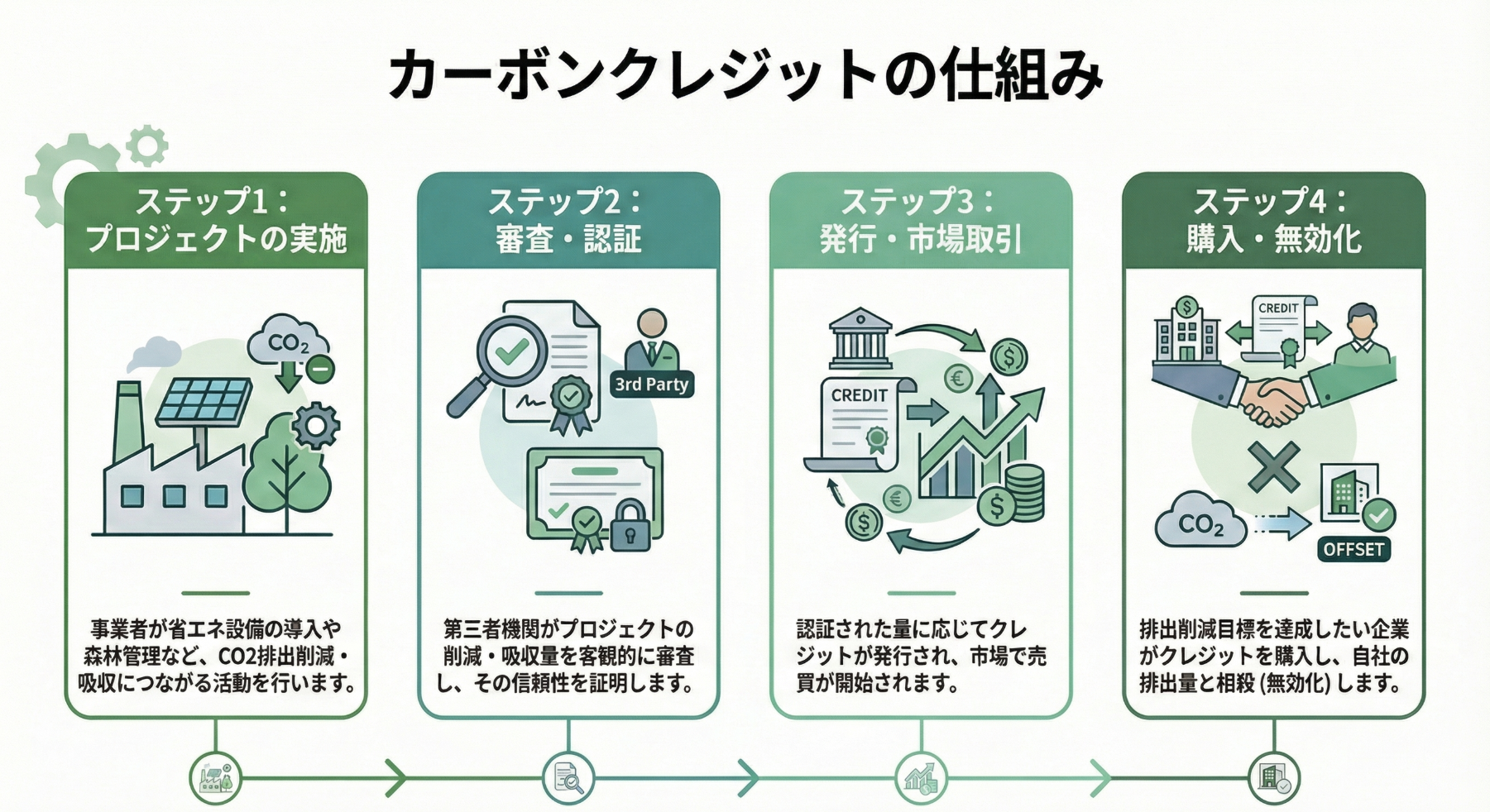 カーボンクレジットはどのように生まれ、使われるのでしょうか。その一連の流れを4つのステップで見ていきましょう。