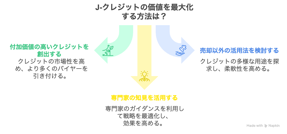 普及しない理由や売れない背景を理解した上で、どうすればJ-クレジットの価値を高め、有効活用できるのでしょうか。ここでは、具体的な3つの戦略を提案します。