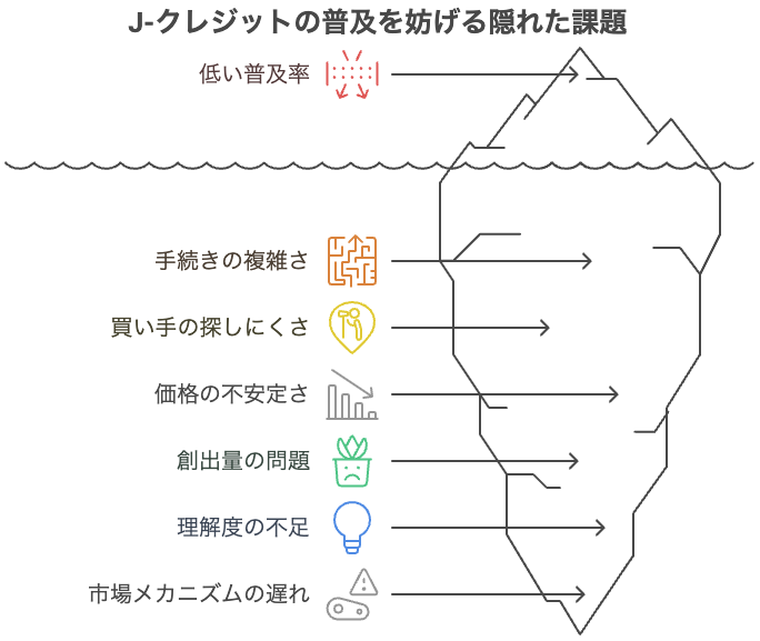 J-クレジットが普及しない背景には、手続きの複雑さ、コスト、市場の未熟さといった複合的な要因があります。特に「売れない」という課題は、多くの企業にとって深刻な問題です。